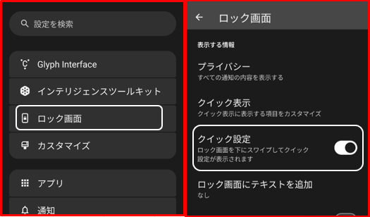 これには設定が必要で、【設定】>【ロック画面】>「クイック設定」を有効にします。