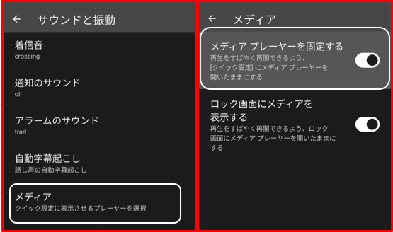 これには設定が必要で、【設定】>【サウンドと振動】>【メディア】>「メディアプレーヤーを固定する」を有効にします。